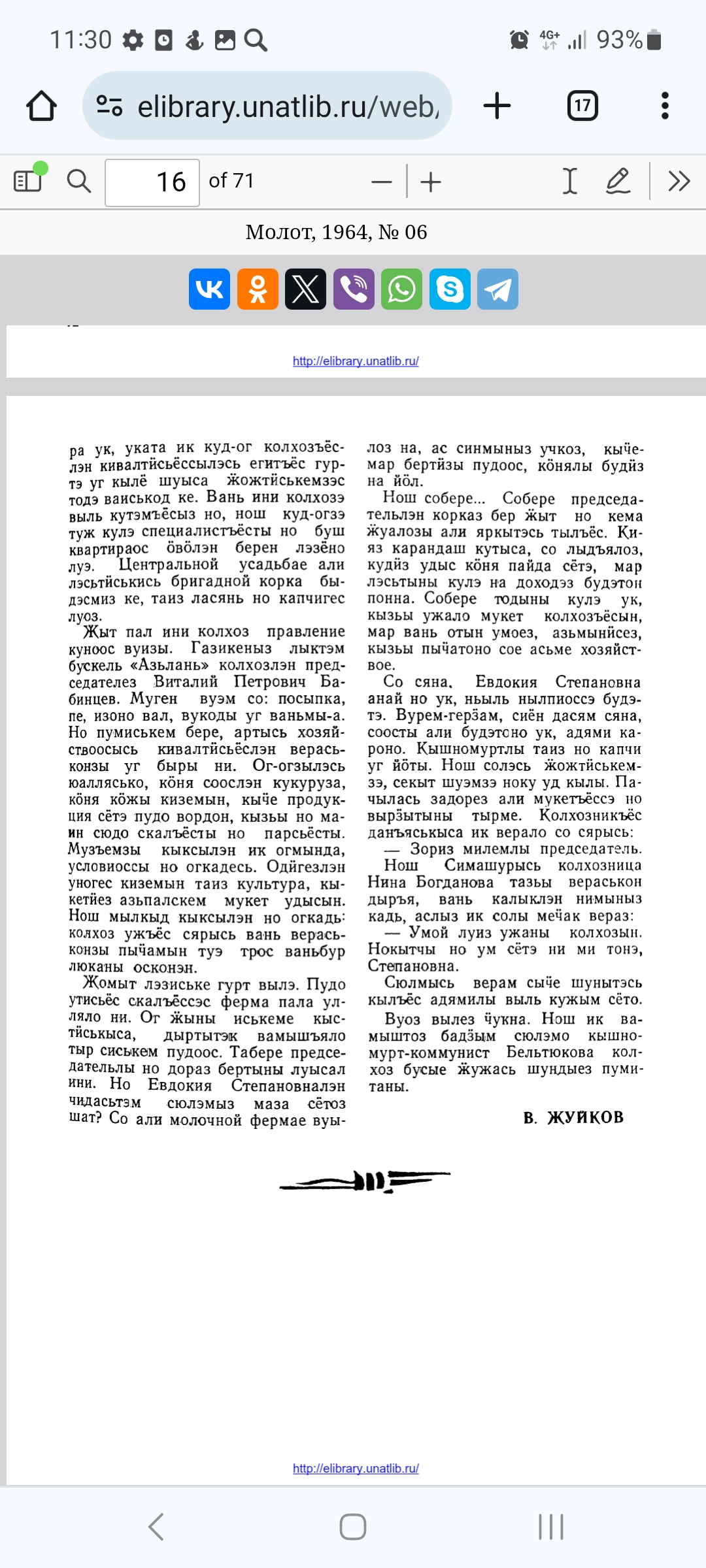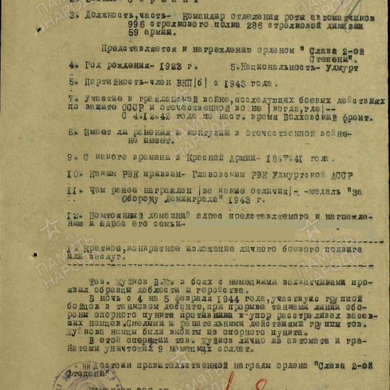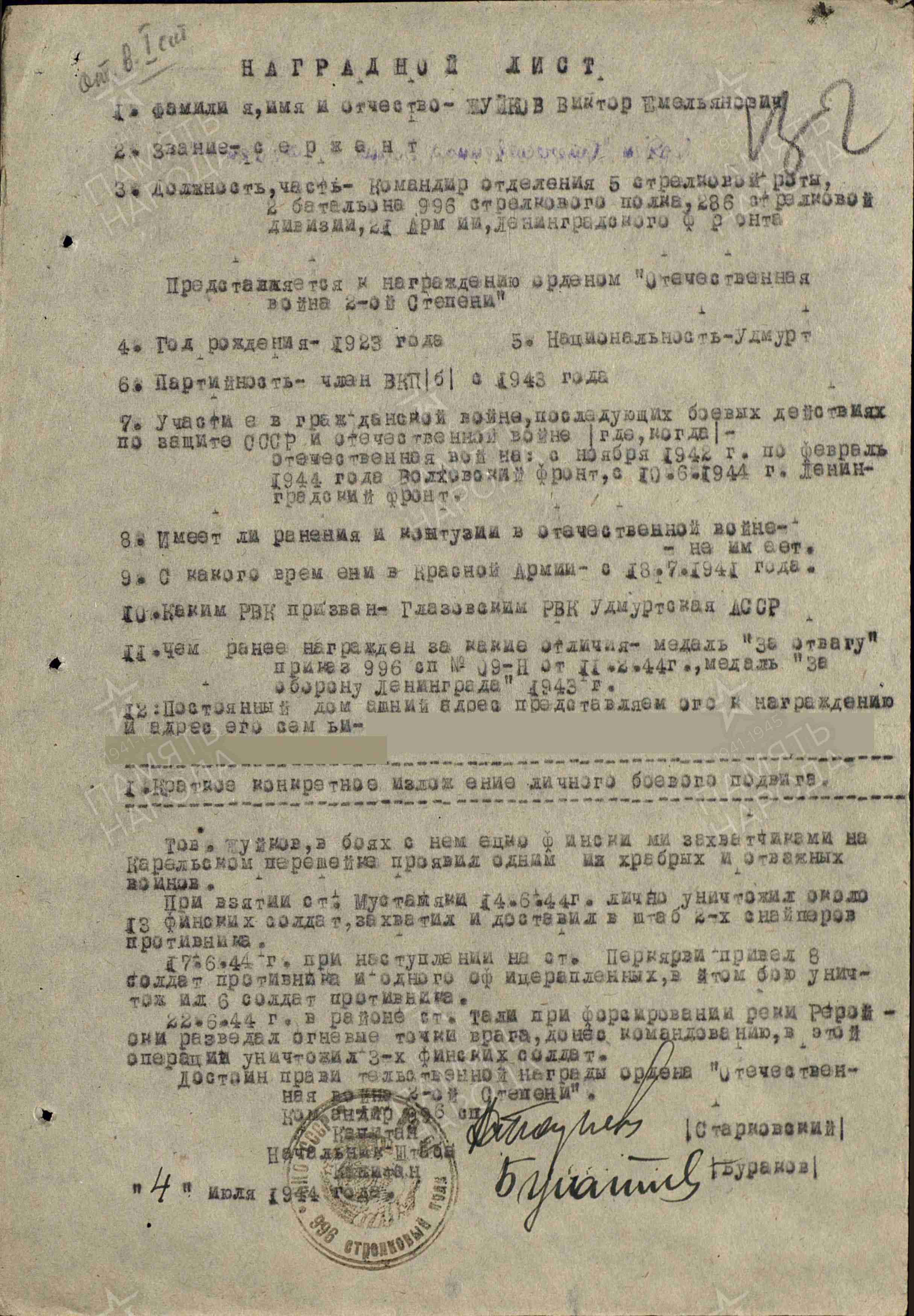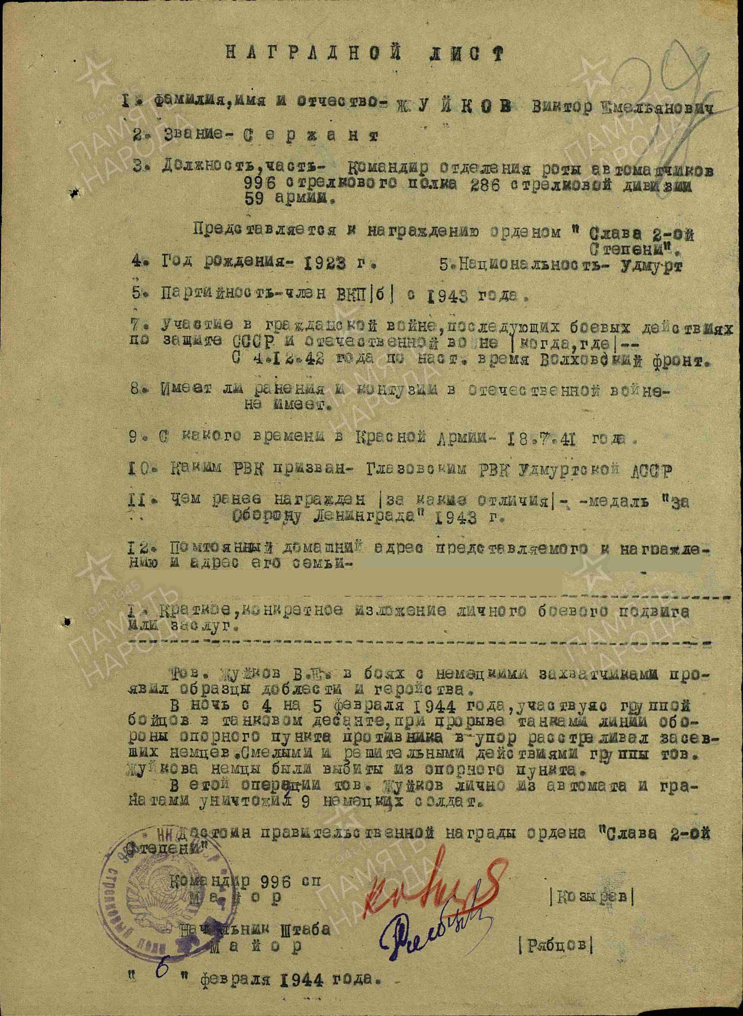 Жуйков Виктор Емельянович родился 07.09.1923 года в деревне Озегвай Глазовского района. 18.07.1941 года (в 17 лет) Глазовским РВК призван на фронт. В составе 996 стрелкового полка 286 стрелковой дивизии 8 Армии Волховского фронта прошел боевой путь от Ленинграда до Польши. С августа 1942 года по 19 января 1943 года принимал участие в обороне Ленинграда. Награжден медалью "За оборону Ленинграда". 11.02.1944 года сержант Жуйков В.Е. - командир отделения роты автоматчиков- награжден медалью "За отвагу". 15.07.1944 года за образцовое выполнение боевых заданий командования на фронте борьбы с немецкими захватчиками и проявленные при этом доблесть и мужество награжден Орденом отечественной войны II степени. Получил ранение в ногу. В 1948 году с отличием окончил Глазовский Государственный учительский институт имени В.Г. Короленко. 02.07.1948 года ему присвоена квалификация учителя 5-7 классов семилетней и средней школы. Работал журналистом - писал статьи в газете "Советская Удмуртия", пьесы о трудовом народе в журнале "Молот", редакция которого находилась в здании Библиотеки им.Ленина г. Ижевска Удмуртской Республики. Был женат, стал отцом двоих дочерей.