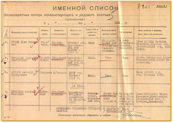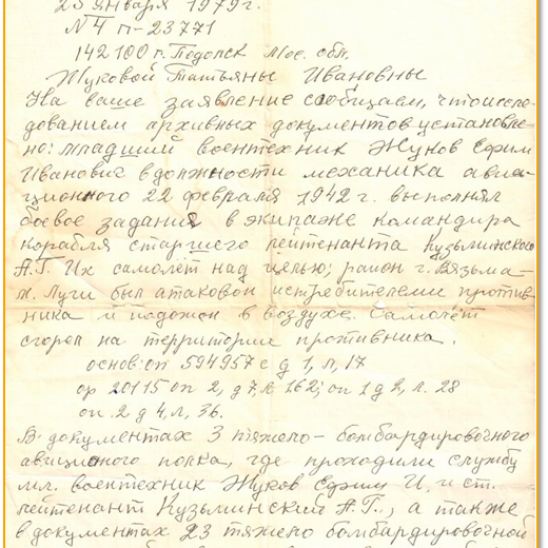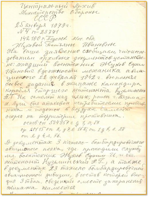Жуков Ефим Иванович являлся кадровым военным, служил в гражданской авиации. Начало войны встретил на границе в Белоруссии. Служил в 23 авиационной дивизии 3 тяжелом бомбардировочном авиаполку. 22 февраля 1942 года, при выполнении боевого задания, он погиб в районе Луги-Великополье, Смоленской обл. Их самолет был атакован и сгорел на территории противника. Погиб весь экипаж кроме штурмана. Долгое время считали пропавшим без вести и только, уже спустя некоторое время, после войны стало известно его место гибели.