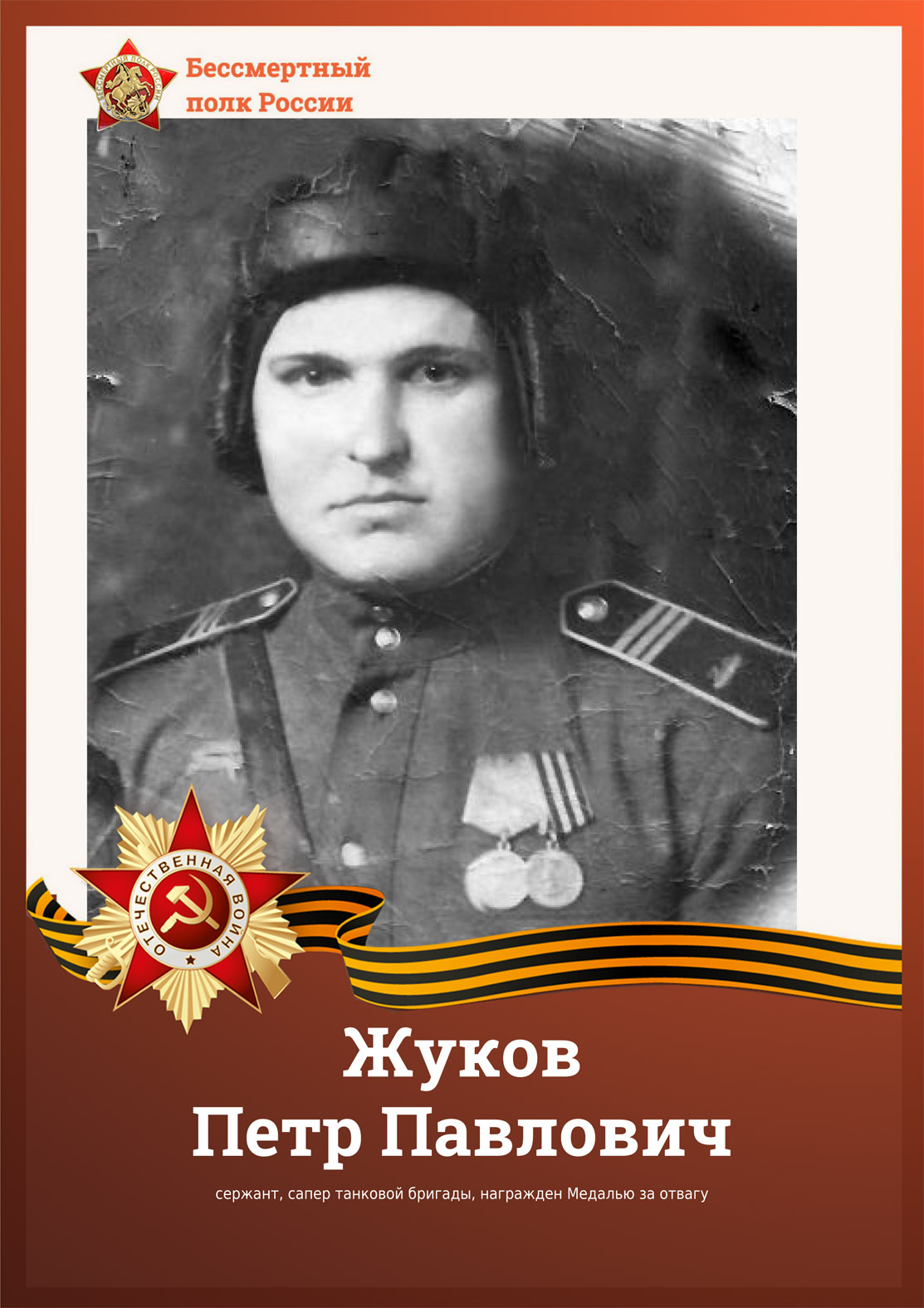 Мой дедушка родился в Подмосковье, 12 июля 1921 года в селе Свитино, детишек в семье было пятеро - три дочери - Анна, Вера и Клавдия, два сына Виктор - он погиб во время войны, Петр (мой дедушка) - самый младший. В 1939 году он был призван в РККА - Красно-Пахорским РВК, Московская обл., Красно-Пахорского р-на. Поэтому когда началась война он был уже в чине сержанта. Служил он на Дальне - Восточном фронте. Дедушка мало рассказывал мне про войну, видимо сыграло роль, то, что когда я была совсем маленькая, он рассказывал, как после боя, ночью, они сидели в танке - было очень жарко, хотелось пить и он вылез из танка и пополз за водой, наткнулся на огромную лужу - набрал в каску воды и пополз обратно к своим ребятам - когда оказался в танке - они увидели что каска была полная крови... На меня тогда, маленькую восьмилетнюю девочку это произвело неизгладимые впечатления, да и до сих пор мне становится страшно, когда пытаюсь представить через, что им пришлось пройти ради нас. Сейчас спустя много лет из архивных документов мы узнали за что дедушке была присвоена медаль "За боевые заслуги" - сначала военных действий он находился в отряде обеспечения движения с 9 по 10 августа августа 1945 года, работая на переправе через реку Биджан, он получил боевую задачу отыскать брод для прохода боевых танков Т-34. не взирая на холод, ночью, он бросился в быстроходную реку, при помощи шеста сумел отыскать брод, установил глубину реки и ее грунт и обеспечил проход боевых машин. Он лично провел 18 танков. Дедушка всегда был веселым человеком, он был великолепным гармонистом и хорошим шахматистом его очень сложно было обыграть!! После войны он был конюхом в его подчинении был конюшенный двор, самый любимый конь - Казбек, скакун серый в яблоко. После того, как всех лошадок разобрали, он работал на пилораме, был великолепным токарем и плотником. А его увлечением было - класть печки, большие русские, в нашем доме их было две!! Так, что ко всему вышеперечисленному он был еще и хорошим печником!! После войны дедушка женился, на моей бабушке, Прокоповой Марии Егоровне у них родилось трое детишек - сын Виктор (его назвали в честь погибшего на войне брата Виктора), и две дочки Галина и моя мама Тамара.
