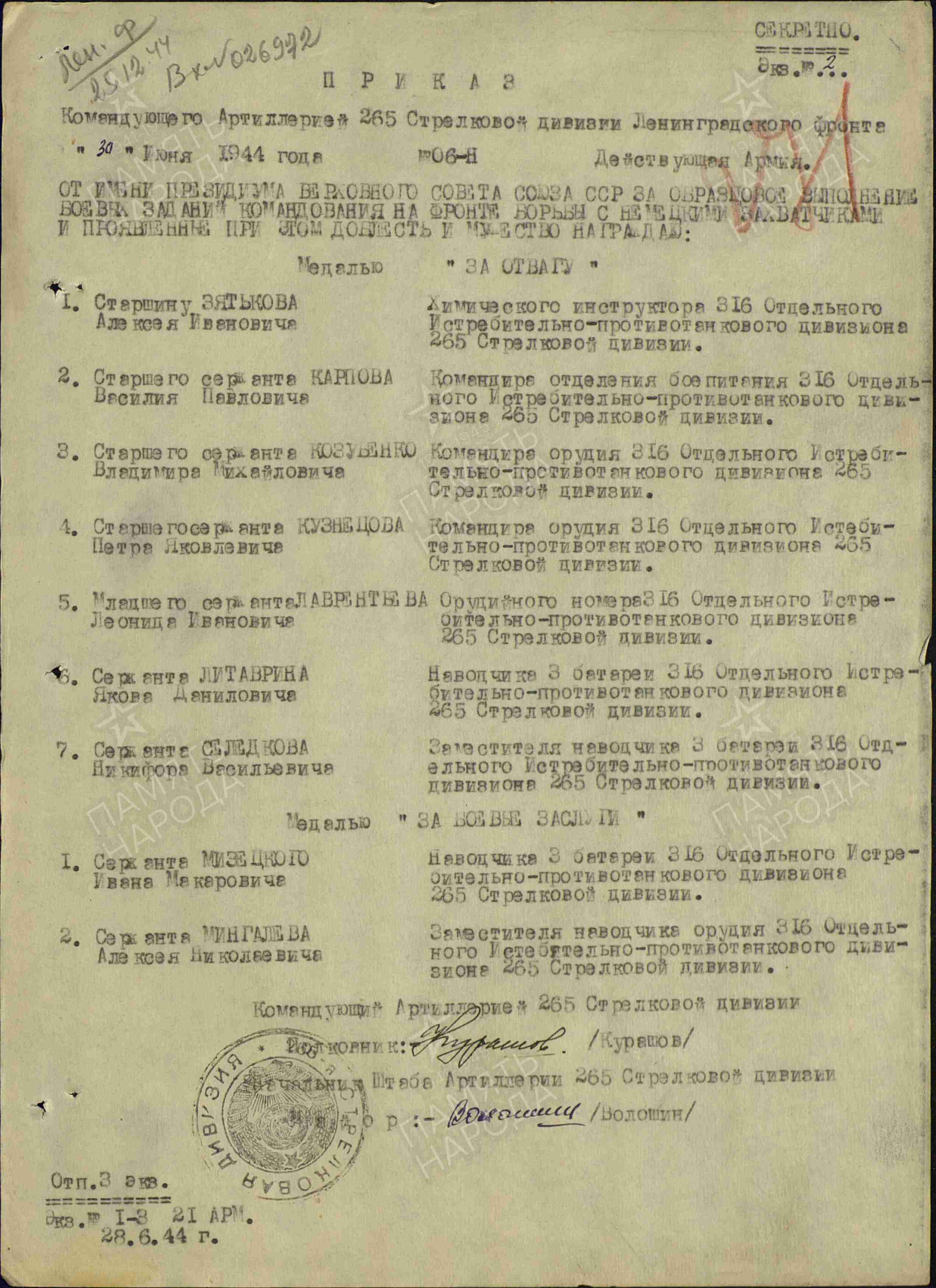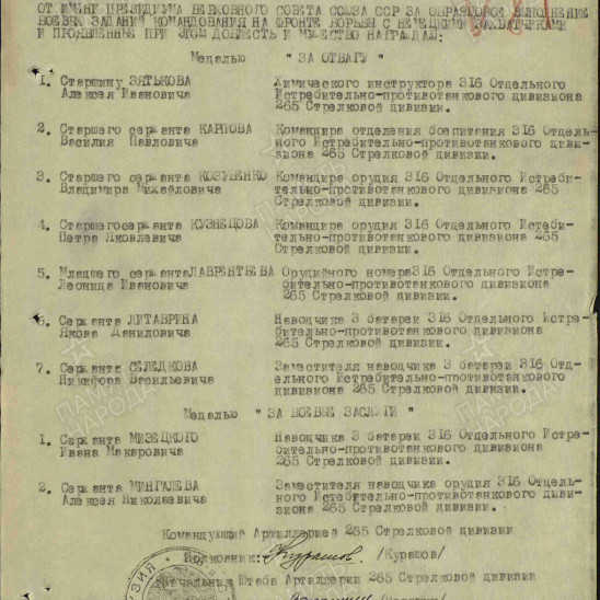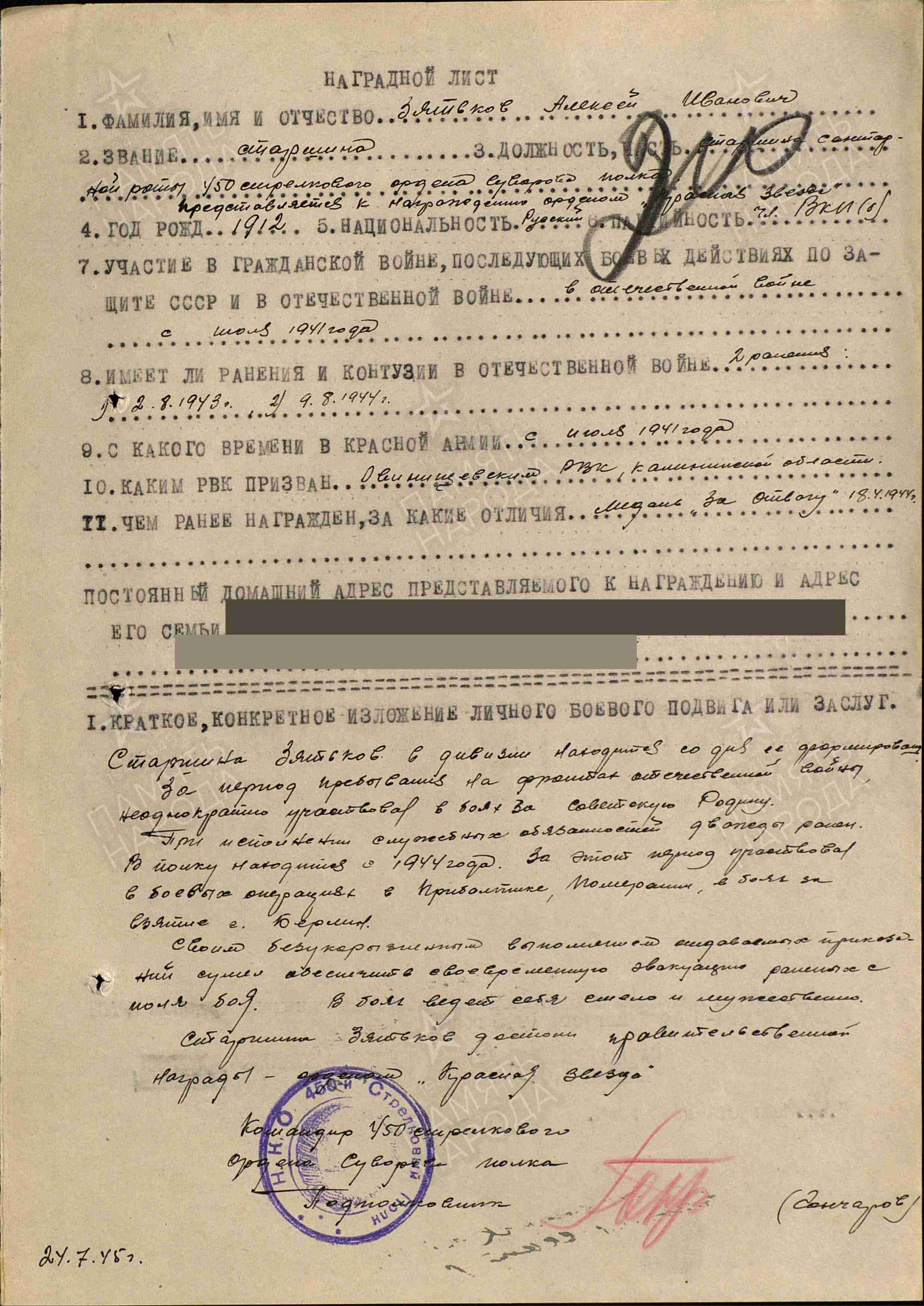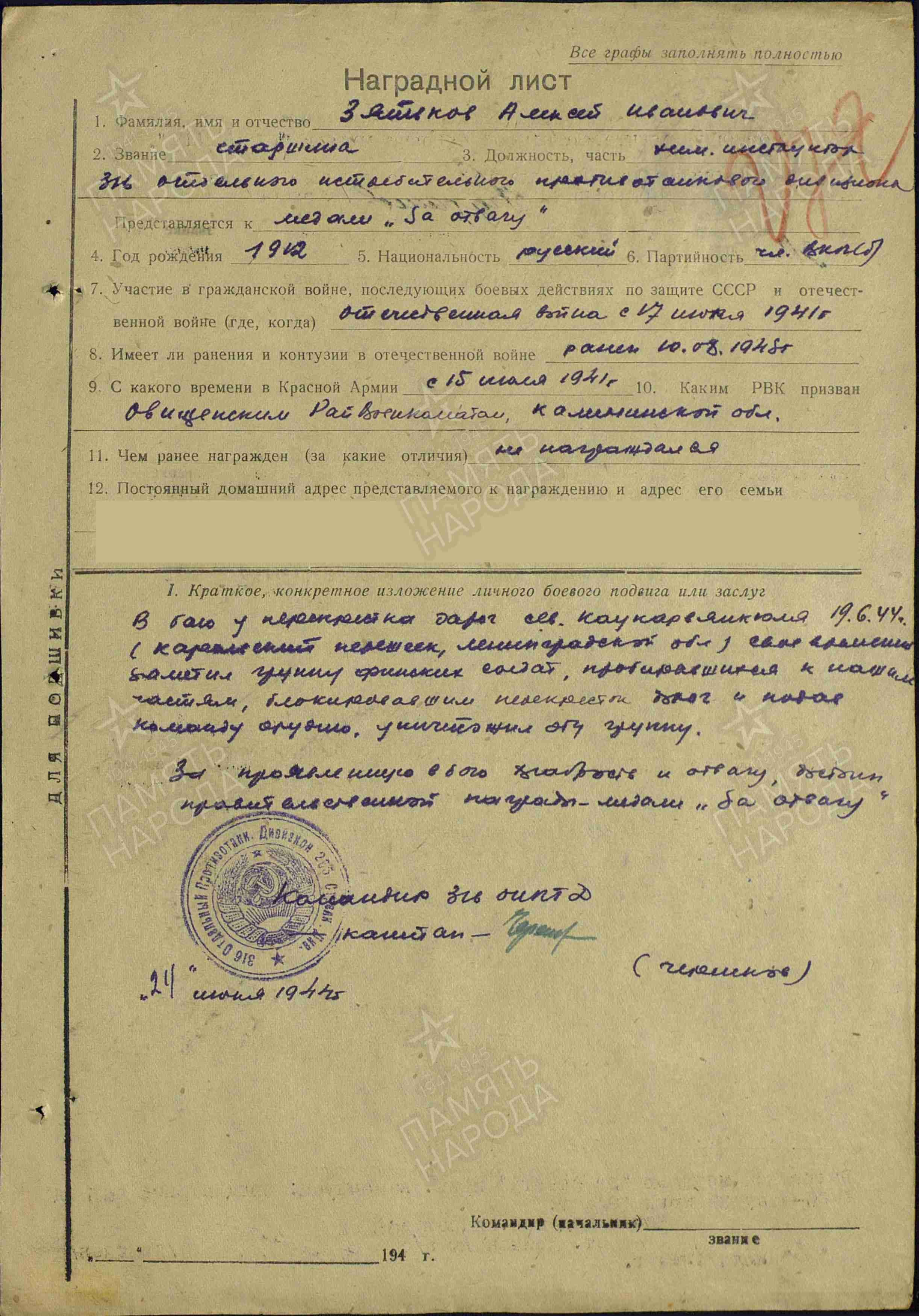 Боевой путь ветерана Свой боевой путь он начал 15 июля 1941 года. Призывался он Овинищенский РВК, Калининская области. Служил в 450 стрелковом полку 265 стрелковой дивизии и 316 отдельном истребительно-противотанковом дивизионе. Он освободил Ленинград, Варшаву, дошел до Германии и освобождал город Берлин. За мужество и героизм награждён медалью «За взятие Берлина», медалью «За отвагу», орденом Красной Звезды, медалью «За оборону Ленинграда», медалью «За победу над Германией в Великой Отечественной войне 1941–1945 гг.»,медалью «За освобождение Варшавы».