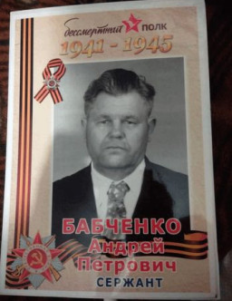 Бабушкина Татьяна Дмитриевна Краснодарский Край 1923 - 1948 Бабушкина (Мазырина) Зинаида Алексеевна 1925 - 2014 Бабушко Александр Романович Бабцев Иван Николаевич 1905 - 1945 Бабцев Тимофей Ефимович Белогорск 1924 - 1945 Бабцев Тимофей Ефимович 1924 - 1945 Бабцев Тимофей Ефимович 1924 - 1945 Бабцов Иван Гаврилович с. Успенское Краснодарского края 1924 Бабцов Николай Николаевич 1921 - 2002 Бабцов Петр Иванович Ростовская область. Кашарский район, с Ново - Павловка 1926 - 1993 Бабченко Андрей Петрович 1923 - 2006 Бабченко Егор Дмитриевич 1900 - 1985 Бабченко Иван Иванович 1925 - 2010 Бабченко Иван Пантелеевич Одесская обл. 1920 - 1991 Бабченко Иван Сергеевич Бабченко Иван Сидорович 1917 - 2010 Бабченко Николай Никитович 1919 - 1944 Бабченко Павел Степанович с. Жовтневое Белопольский район Сумская область 1915 - 2001 Бабченко Пётр Андреевич 1918 - 1991 Бабченко Федор Яковлевич С.Нины, Ставропольский край 1904 - 1978