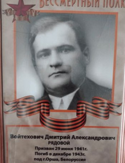 Войтехович Дмитрий Яковлевич 1904 - 1943 Войтик Василий Владимирович Ворошиловградская область, Верхне-Тепловский район село Войтово 1920 - 1941 Войтик Григорий Данилович 1913 - 1985 Войтик Иван Григорьевич Называевский район, с. Путь Социализма 1925 Войтик Иосиф Адамович 1922 - 2017 Войтиков Иван Григорьевич Омская область, Называевский район, с. Путиловка 1925 Войтиков Илья Иванович 1910 Войтин Василий Дмитриевич 1911 - 1987 Войтин Георгий Яковлевич Оренбургская обл. 1916 - 1967 Войтин Георгий Яковливич 1916 - 1967 Войтинский Борис Соломонович 1918 Войтишин Степан Сафронович 1917 - 1943 Войтишко Иван Севастианович 1912 - 1988 Войтишко Николай Петрович Войткевич Анатолий Францевич Войткевич Анатолий Францевич Войткевич Борис Александрович г. Калач, Ростовской обл. 1927 - 2016 Войткевич Борис Осипович 1923 - 1990 Войткевич Владислав Александрович д. Волтуп Ошмянского р-на Виленской губернии 1914 Войткевич Иннокентий Иосифович 1910 - 1986
