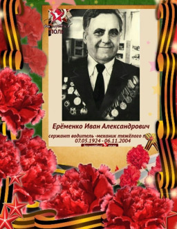 Еременко Владимир Васильевич 1926 - 2008 Еременко Владимир Федорович Харьковская обл. 1909 - 1994 Ерёменко Геннадий Андреевич 1926 - 2013 Еременко Григорий Кузьмич 1919 - 1979 Ерёменко Данил Яковлевич с. Ерковцы, Киевская область 1906 - 1994 Ерёменко Дмитрий Александрович 1908 - 1944 Ерёменко Дмитрий Емельянович 1909 Еременко Дмитрий Иванович Ставропольский край Ипатовский р-он с.Лиман 1910 - 1995 Ерёменко Дмитрий Иванович 1924 - 2010 Ерёменко Дмитрий Иванович 1914 - 1974 Еременко Дмитрий Николаевич 1911 - 1988 Ерёменко Дмитрий Яковлевич 1901 Еременко Екатерина Филипповна Г.Воронеж 1928 - 2023 Еременко Емельян Николаевич 1907 - 1945 Еременко Иван Акимович Курская область Суджанский р-н с. Уланок 1922 - 2000 Ерёменко Иван Александрович село Семеновка Федоровского района Саратовской области 1924 Ерёменко Иван Александрович 1926 - 2011 Ерёменко Иван Александрович 1924 - 2004 Еременко Иван Афанасьевич 1922 - 1991 Ерёменко Иван Васильевич 1918