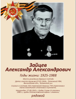 Зайнутдинов Ямгутдин Фатхудинович 1912 - 1986 Зайнутдинова Эльвина Гарифулловна 1935 - 2012 Зайончковский Владислав Карлович 1912 - 1991 Зайруллин Газим Зайдуллович Зайруллин Хусаин Хакеевич 1925 - 2007 Зайц Лидия Петровна 1925 - 1987 Зайцава Анна Николаевна Зайцев Акиндин Алексеевич 1925 - 1995 Зайцев Акиндин Алексеевич 1925 - 1995 Зайцев Александр Зайцев Александр Александрович Вологодская обл., Тотемский р-н, д. Слобода 1925 - 1988 Зайцев Александр Александрович 1925 - 1984 Зайцев Александр Алексеевич с. Горячка, Вольский район, Саратовская обасть 1914 Зайцев Александр Алексеевич 1924 - 1997 Зайцев Александр Алексеевич 1905 - 1988 Зайцев Александр Алексеевич 1924 - 1997 Зайцев Александр Андреевич Южно-Казахстанская область, Тюлькубасский район, село Сергиевка 1912 Зайцев Александр Андреевич 1908 - 1958 Зайцев Александр Андреевич 1914 - 1987 Зайцев Александр Андреевич 1925 - 1969