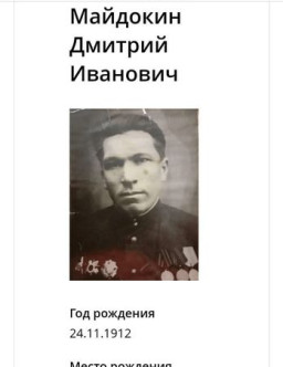 Майданникова Раиса Гавриловна 1923 - 2012 Майданов Александр Дмитриевич 1912 Майданов Василий Ефимович 1904 Майданов Григорий Алексеевич 1906 - 1972 Майданов Дмитрий Иосифович 1908 - 1974 Майданов Михаил Никифорович 1924 - 1990 Майданов Николай Никифорович 1910 - 1942 Майданов Павел Федорович 1922 - 2003 Майданов Феофан Иванович 1911 - 1941 Майданович Иван Семенович Житомирская обл., Емильчинский р-он, д.Андреевичи 1912 - 1995 Майданюк Владимир Максимович 1925 - 1994 Майданюк Филипп Саввович с. Суповка, Барский район, Винницкая область, УССР 1909 - 1985 Майдебура Василий Иванович Майдебурский Николай Захарович 1920 - 1975 Майдельман Ушер Маркович Украинская ССР, Житомирская обл., г. Троянов 1918 - 1972 Майдеросов Априом Артемович 1918 - 1995 Майдеросов Гайк Артемович 1916 - 1944 Майдеросова Тамара Артемовна 1927 - 1944 МАЙДЕЦКИЙ ГЕОРГИЙ ИВАНОВИЧ 1913 - 1985 Майдокин Дмитрий Иванович 1912