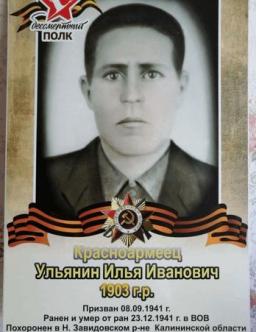 Ульшина Валентина Ивановна 1925 - 2008 Ульябаев Адигам Мырзагалеевич 1906 - 1995 Ульябаев Нуриахмет Абдрахманович 1914 - 2002 Ульябаев Юмагужа Хусаинович 1915 Ульянеев Николай Михайлович 1913 - 1985 Ульяненко Александр Исаевич 1916 - 1960 Ульяненко Артем Васильевич 1914 - 1980 Ульяненко Василий Иванович село Засосна Красногвардейского района Белгородской области 1911 - 1982 Ульяненко Иван Иванович c. Бирючок Будённовского р-на Воронежской обл. 1926 - 2005 Ульяненко Павел Иванович г.Макеевка Донецкая обл. 1911 - 1994 Ульяненков Леонид Степанович 1926 - 2014 Ульянин Виктор Иванович Ульянин Илья Иванович Ульянин Никифор Иванович 1920 - 1996 Ульянин Петр Петрович Пензенская обл., Сердобский р-н, с. Секретарка 1920 - 1985 Ульянин Юрий Алексеевич город Москва 1926 - 2010 Ульянин Яков Алексеевич 1900 - 1973 Ульянина Наталья Ефимовна 1906 - 1989 Ульянич Григорий Тимофеевич 1906 Ульянич Григорий Тимофеевич