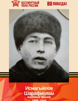 Исмагулов Абдурахман Конесбаевич 1923 - 1999 Исмагулов Алймурат Адамович 1920 Исмагулов Джумакай Иксанович Исмагулов Кайыргали 1919 - 1993 Исмагулов Нариман Село Ганюшкино Денгизского района Гурьевской области 1925 Исмагулов Николай Исмагыйлов Шарафислам Исмагыйлович Деревня Деушево 1896 - 1944 Исмаев Адам Адамович Исмаев Ахмед Бетердынович 1906 - 1942 Исмаилов Абдулхаким Исакович Абдулхаким родился в селе Аксай Хасавюртовского округа Терской области 1916 - 2010 Исмаилов Абдулхаким Исакович 1916 - 2010 Исмаилов Абдулхаким Исакович 1916 - 2010 Исмаилов Абдулхан Сабирович г. Мары Туркменской ССР 1920 - 1985 Исмаилов Абдулхан Сабирович 1920 - 1985 Исмаилов Абдурахман Исмаилов Абуталиб Исрафилович с. Нижний Катрух Рутульский район ДАССР 1921 - 2005 Исмаилов Аджар 1924 - 2009 Исмаилов Али Исмаилов Ашраф Исмаилович Смугул 1922 - 2015 Исмаилов Геннадий Исмаилович Челябинская область, Нагайбакский район, село Кызыл-Казах 1925 - 1972