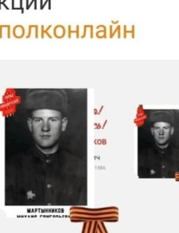 Мартынец Прохор Кузьмич с.Азаровка Воронокского района Брянской области 1903 - 1959 Мартынецкий Владимир Петрович 1918 - 2009 Мартынин Александр Дмитриевич 1914 - 1972 Мартыничев Дмитрий Игнатьевич Курская область 1916 - 1996 Мартынкин Василий Матвеевич 1919 - 1995 Мартынкин Василий Матвеевич 1919 - 1995 Мартынкин Константин Петрович 1915 - 1980 Мартынкин Николай Федорович 1908 - 1956 Мартынков Фёдор Иванович Мартынников Михаил Григорьевич 1924 - 1986 Мартынников Михаил Григорьевич 1924 - 1986 Мартынников Михаил Григорьевич 1924 - 1986 Мартынов Абрам Егорович Мартынов Абрам Егорович 1897 - 1943 Мартынов Акил Прокладович 1897 - 1987 Мартынов Аким Иванович 1909 - 1941 Мартынов Александр Александрович Пензенская обл., Большевьясский р-н, д. Карабановка 1924 Мартынов Александр Алексеевич город Барнаул 1926 Мартынов Александр Алексеевич г. Орехово-Зуево, Московская область 1927 - 1999 Мартынов Александр Алексеевич 1914 - 2018