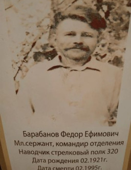 Барабанов Николай Константинович 1898 - 1942 Барабанов Николай Михайлович д.Большие Осинки Нижегородской губернии 1915 - 2000 Барабанов Николай Михайлович 1916 - 2000 Барабанов Пётр Андреевич 1920 - 2007 Барабанов Петр Васильевич 1921 - 1980 Барабанов Пётр Илларионович город Бузулук Оренбургской области 1926 - 2006 Барабанов Сергей Митрофанович 1919 - 1984 Барабанов Федор Васильевич 1902 - 1969 Барабанов Федор Ефимович 1921 - 1995 Барабанов Федор Лукич ст. Пещенокопская Ростовской области 1909 Барабанов Федосей Егорович Барабанов Яков Николаевич 1917 - 2000 Барабанова Александра Васильевна Барабанова Валентина Сергеевна 1921 - 1985 Барабанова Елизавета Михайловна 1911 - 1986 Барабанова Лидия Алексеевна 1926 - 2021 Барабанова Тамара Николаевна Воронежская обл., Водопьяновский район, с.Донское 1925 - 1996 Барабанщиков Ананий Захарович Барабанщиков Антон Игнатьевич 1922 - 1988 Барабанщиков Георгий Михайлович 1919 - 2002