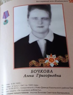Бочков Фёдор Иванович Зубово-полянский район 1914 - 1996 Бочков Фёдор Иванович Пензенская область Лопатинский район с.Пылково 1911 - 1948 Бочков Федор Иванович 1913 - 1976 Бочков Яков Васильевич 1905 Бочкова Анна Гавриловна П. Ново-Украинка, Актюбинская обл. 1922 - 1987 Бочкова Анна Григорьевна 1928 - 2013 Бочкова Анна Дмитриевна 1924 - 2015 Бочкова Анна Дмитриевна хутор Грязновка 1924 - 2015 Бочкова Валентина Андреевна с. Макарово Макаровского (ныне Ртищевского) района Саратовской области 1919 Бочкова Валентина Васильевна 1924 - 1986 Бочкова Евдокия Васильевна 1923 - 1994 Бочкова Елизавета Никитична Село сулак 1928 - 2006 Бочкова Зоя Александровна 1922 - 2002 Бочкова Мария Яковлевна 1926 - 2005 Бочкова Прасковья Иванова Бочкова Татьяна Дмитриевна Рязанский район 1914 - 2021 Бочковая Евгения Захаровна 1922 - 2001 Бочковой Павел Георгиевич 1916 - 1985 Бочковой Пётр Иванович 1909 - 1990 Бочковой Пётр Иванович 1909 - 1990