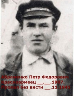 Абраменко Павел Данилович 1910 - 1941 Абраменко Павел Денисович 1919 - 1990 Абраменко Павел Денисович 1919 - 1990 Абраменко Павел Никанорович село Капустин Яр Владимировской района Астраханской области 1914 - 1969 Абраменко Павел Федорович 1904 Абраменко Пётр Васильевич с. Ивня Курской области 1925 Абраменко Петр Иванович 1906 - 1959 Абраменко Петр Павлович Абраменко Петр Федорович 1907 - 1941 Абраменко Петр Фёдорович 1926 - 1977 Абраменко Семён Артамонович 1913 - 1993 Абраменко Сергей Григорьевич 1922 - 2002 Абраменко Степан Иванович Воронежская тбл, Новохоперский район, село Подосиновка 1901 - 1996 Абраменко Степан Иванович 1901 - 1996 Абраменко Степан Михайлович с. Подкуйково Руднянского района Волгоградской области 1907 - 1990 Абраменко Терентий Архипович 1910 - 1995 Абраменко Тихон Михайлович Воронежская обл., Острогожский р-н, Н. Осиновский с/с с.Гумны 1916 - 1943 Абраменко Яков Борисович Белоруссия 1894 - 1972 Абраменков Александр Николаевич 1922 - 1987 Абраменков Василий Алексеевич 1923 - 1975