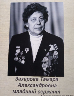 Захарова Пелагея Ивановна 1918 - 1998 Захарова Петр Семенович 1914 - 1943 Захарова Руфина Алексеевна Захарова Софья Ивановна 1922 - 2006 Захарова Софья Петровна 1924 - 1996 Захарова Таисия Ивановна 1921 - 2010 Захарова Тамара Александровна 1923 - 2009 Захарова Тамара Александровна 1923 - 2009 Захарова Татьяна Васильевна Горьковская область 1922 - 2005 Захарова Татьяна Ивановна 1915 - 2004 Захарова Фаина Федоровна д. Острово Орехово-Зуевского р-на Московской области 1925 - 2001 Захарова (Гаврилова) Валентина Павловна 1923 Захарова (Егорова) Антонина Павловна 1919 - 1994 Захарова (Канер) Анна Ефимовна 1922 - 2005 Захарова (Швец) Надежда Дмитриевна с. Копиевка Дашевского р-на 1926 - 2015 Захарова-Быбина Зинаида Васильевна 1919 - 2002 Захарова-Климова Валентина Ильинична 1929 - 2017 Захарова-Мальцева Анастасия Яковлевна 1908 - 1999 Захарова-Мудрецова Анастасия Никитична 1922 - 1997 Захарова-Шмырев Валерия Нестеровна 1928 - 2001